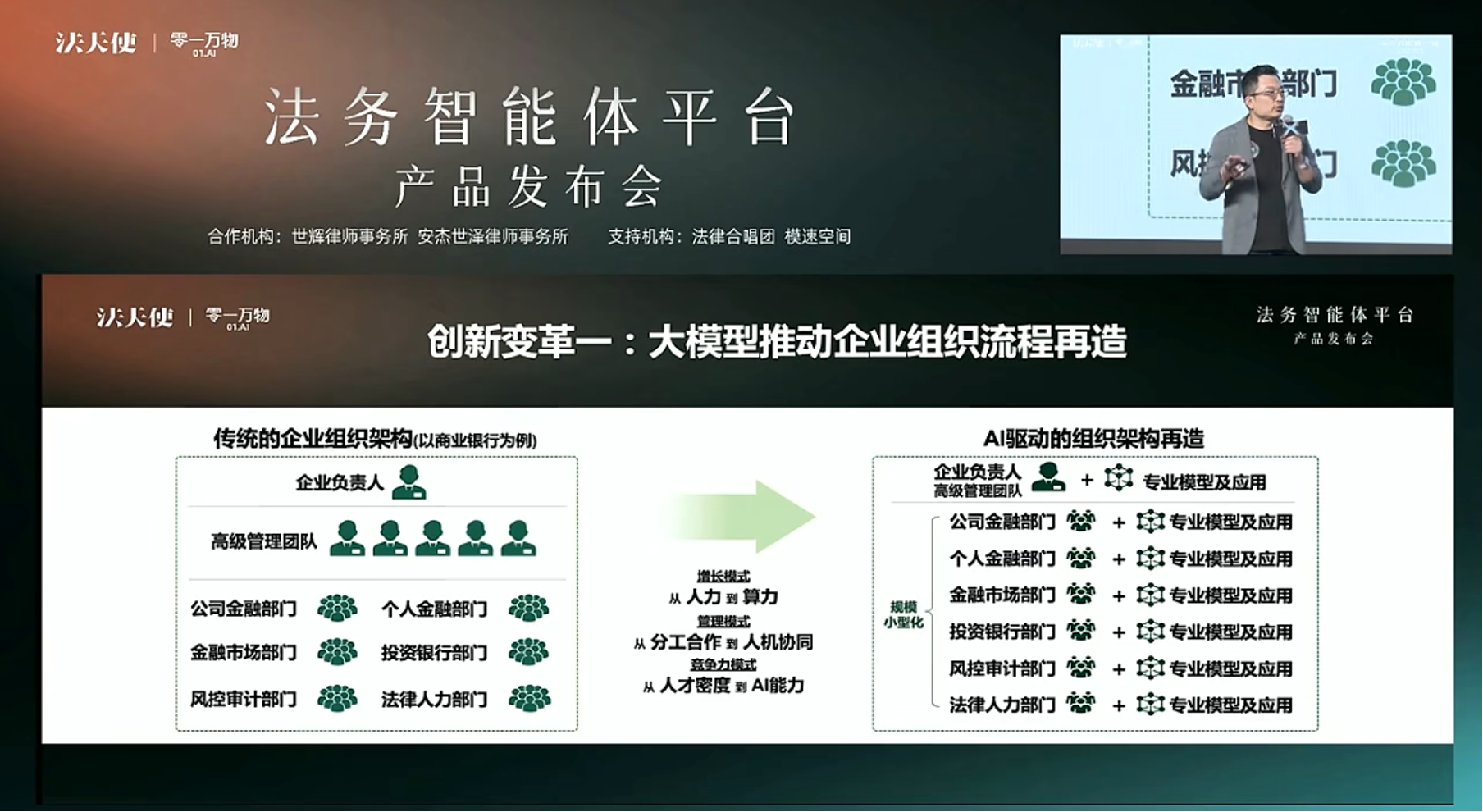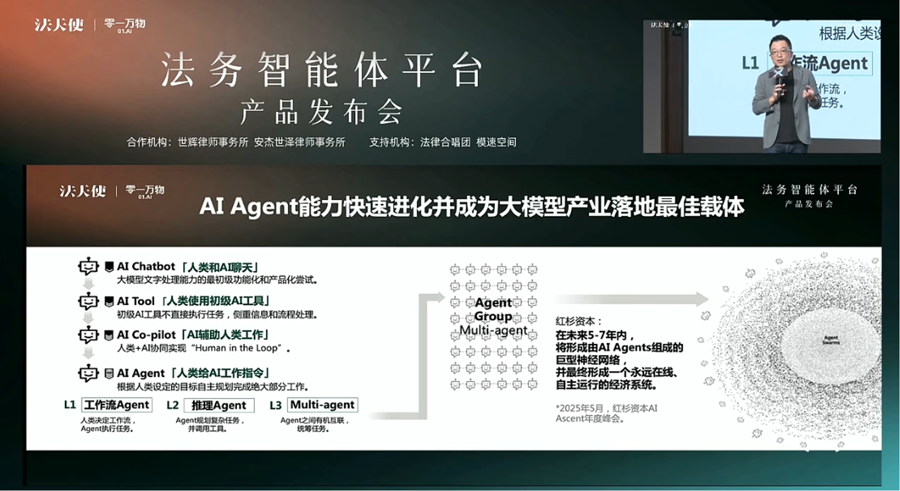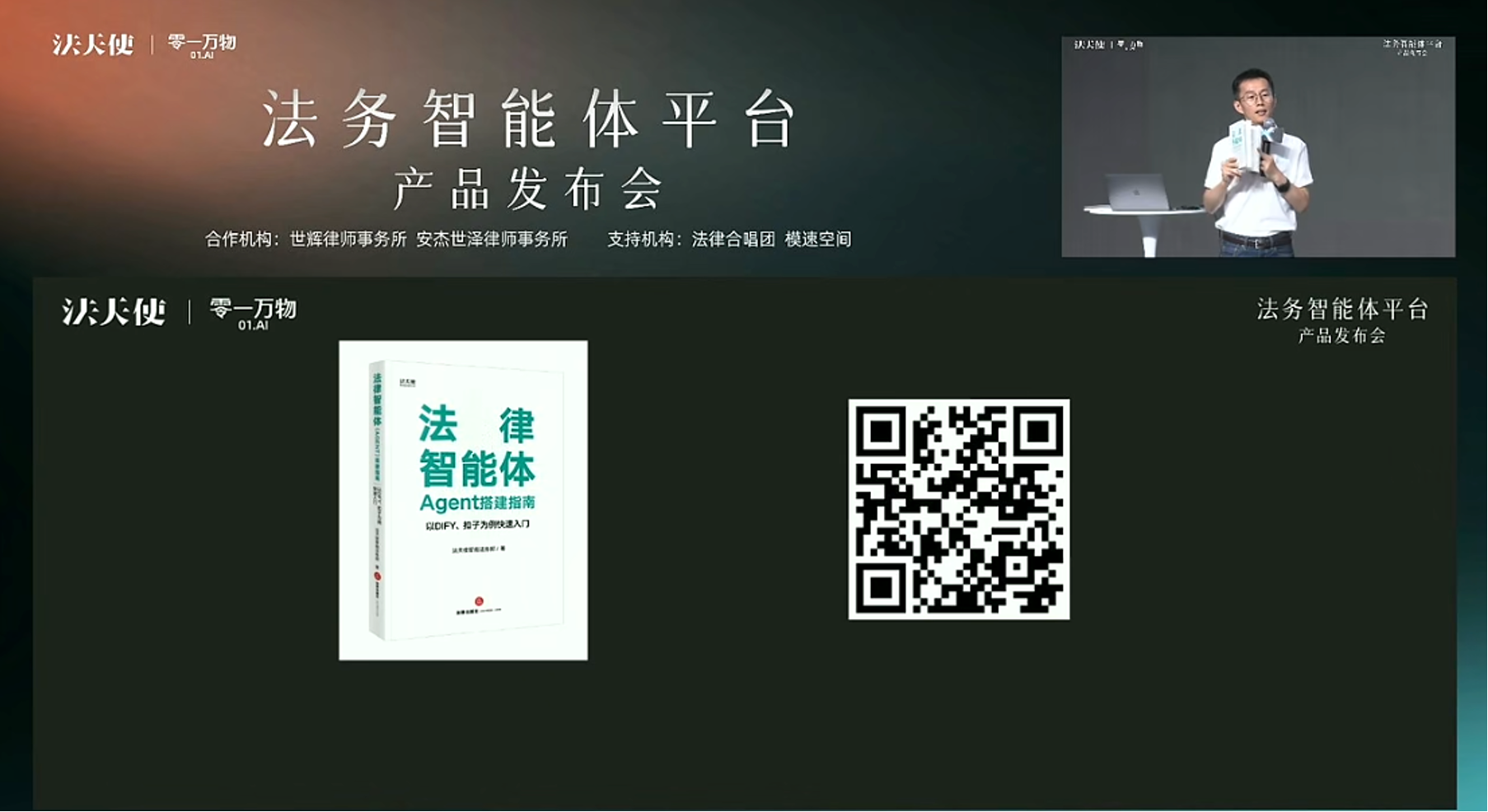 零一万物创始人兼CEO李开复博士为本次发布会做了视频开场致辞。他提到,这次与法天使的合作,提出了行业首个“知识库+工作流+AI”全栈解决方案,这不仅是技术与行业的融合,也将成为法务行业迈向智能化的重要里程碑。