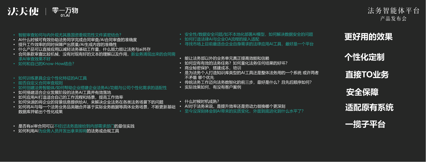 据此,法天使和零一万物联合发布的「法务智能体平台」将会呈现三项功能亮点: